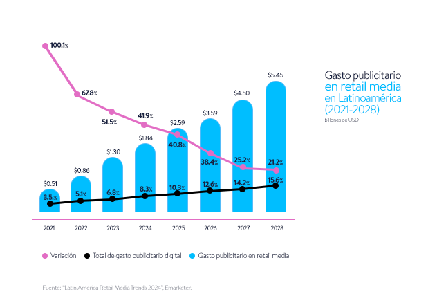 El retail media, la estrategia publicitaria que permite a las marcas anunciarse en tiendas físicas y digitales de retailers, está reconfigurando por completo el mundo de la publicidad y de su inversión publicitaria. Las proyecciones son contundentes, el gasto en retail media en el mundo seguirá aumentando de manera estable, siendo Latinoamérica la región con un crecimiento más acelerado (11.7% de tasa de crecimiento anual compuesta, 2.4 veces más rápida que en otras regiones).