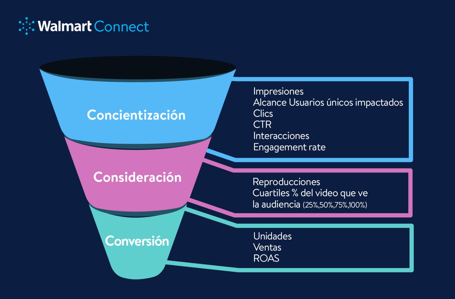 Con Social Commerce de Walmart Connect, puedes implementar una estrategia integral que abarca desde la concientización y consideración hasta la conversión, con la capacidad de medir el impacto en cada etapa del embudo. Esto significa que puedes generar interés en tu marca, despertar el deseo por tus productos e impulsar las ventas, todo desde las plataformas sociales favoritas de tus clientes.