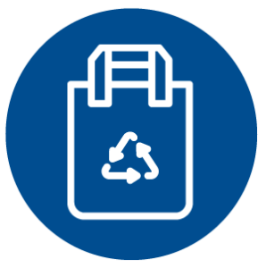 Bolsas reutilizables de tela y plástico hasta 50% reciclado vendidas en nuestras tiendas, así como bolsas de papel kraft en las que nuestros clientes reciben sus pedidos a domicilio.
